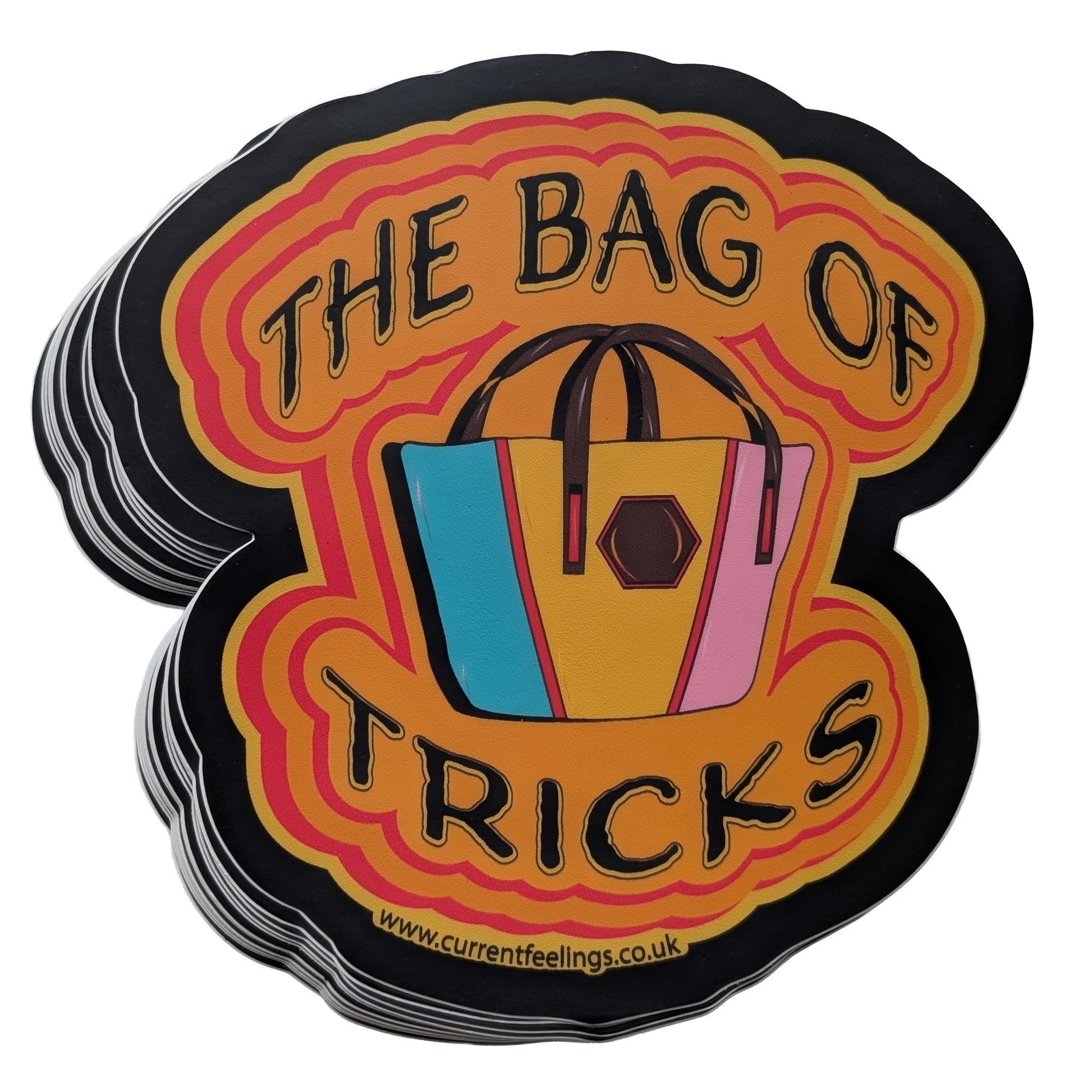 The Bag Of Tricks. Available in 5-inch sticker. You can stick it wherever outdoors or indoors, laptop, water bottle, car bumper or skateboard, decks.
